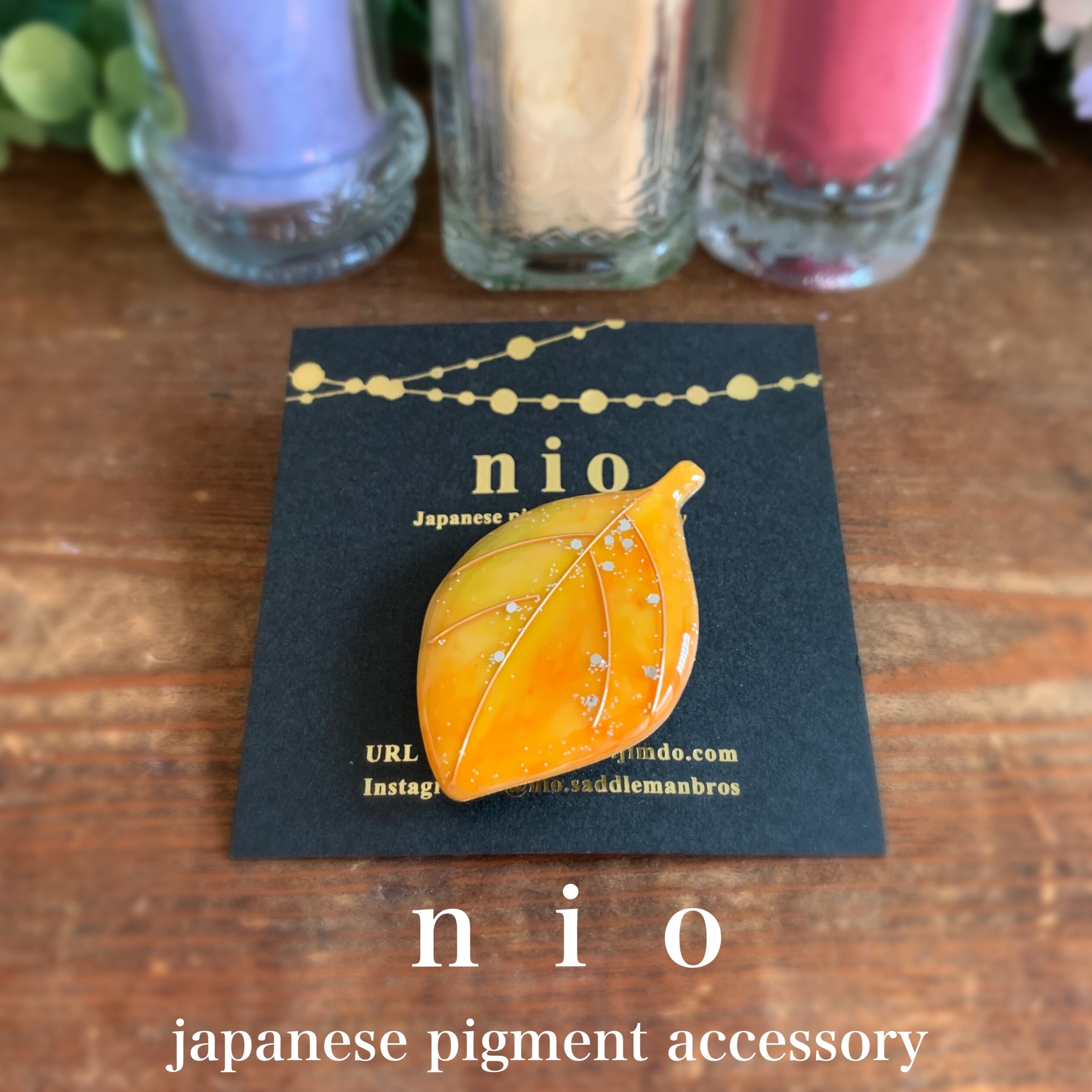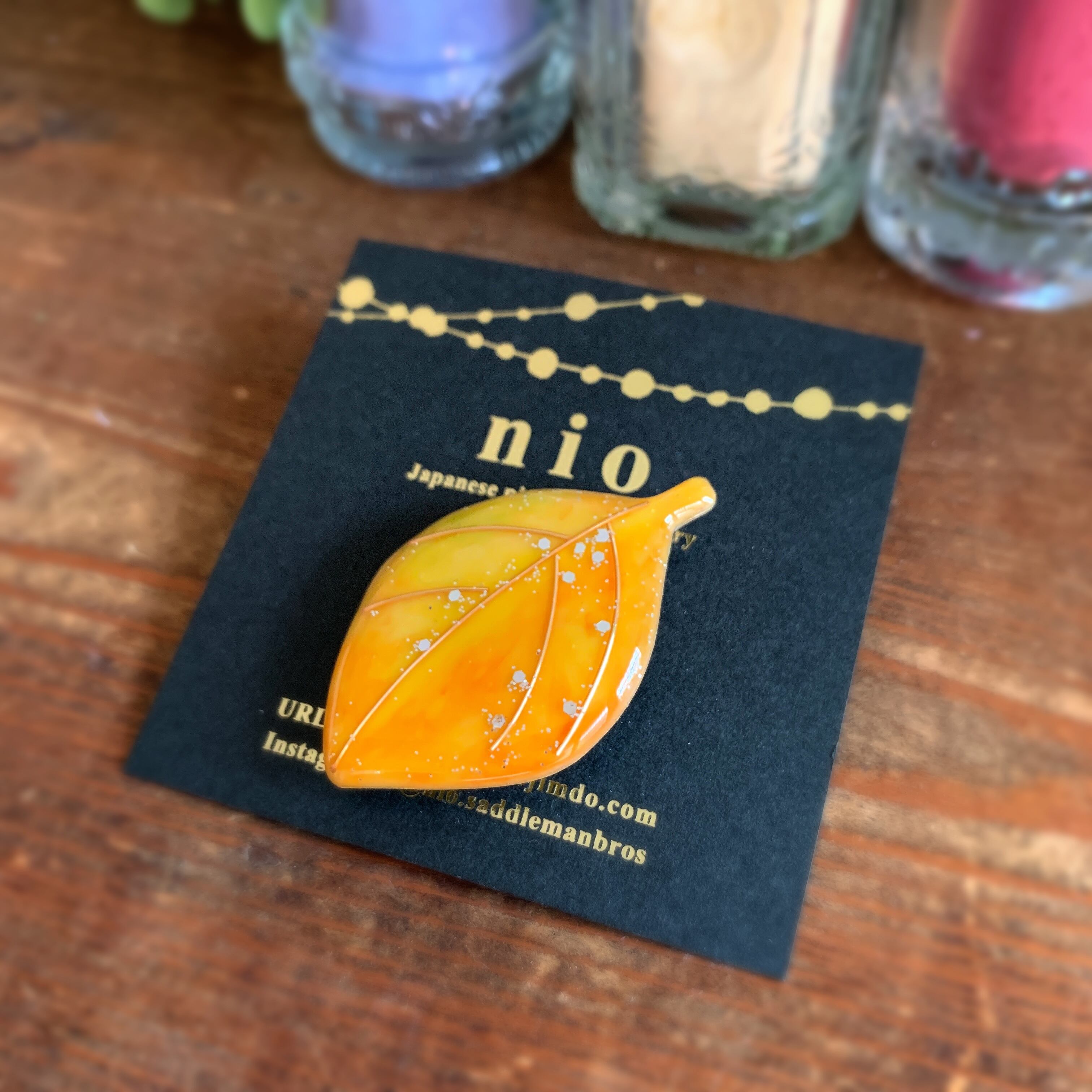 黄色と橙色をグラデーションにした葉っぱのブローチ。