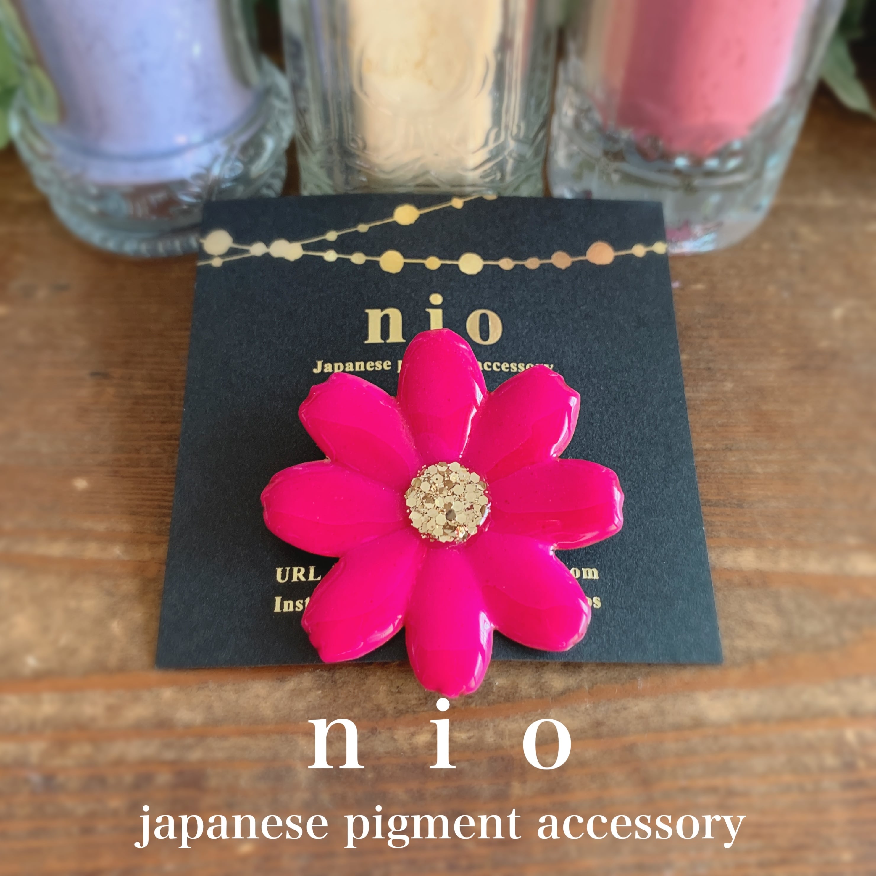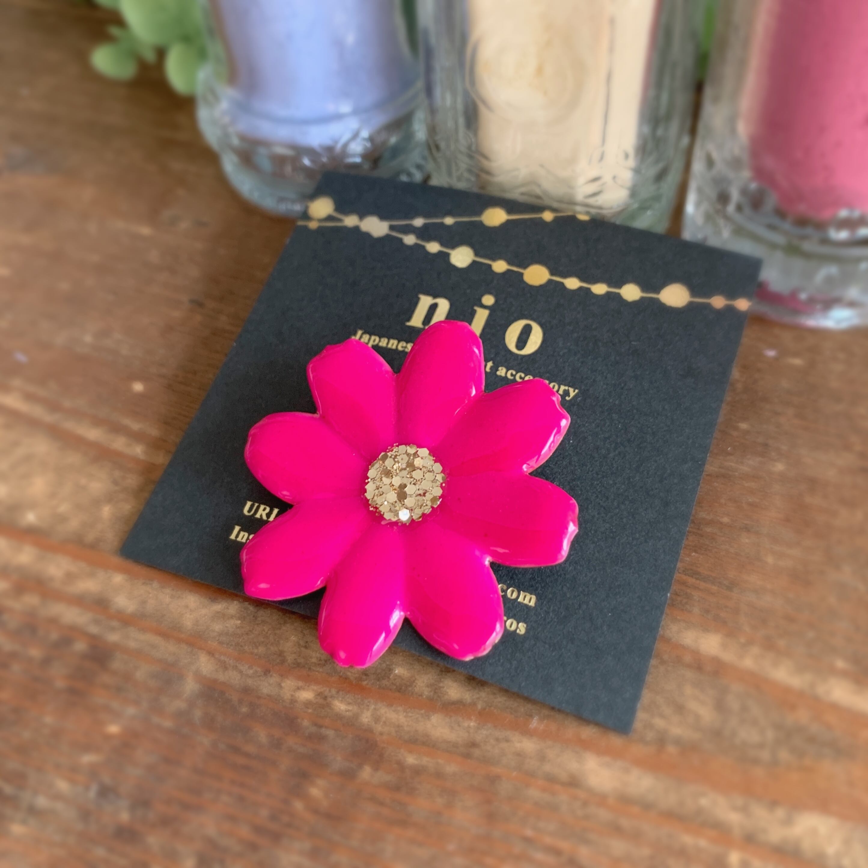 「牡丹色」を使った、ビビットなピンク色のコスモスのブローチ。