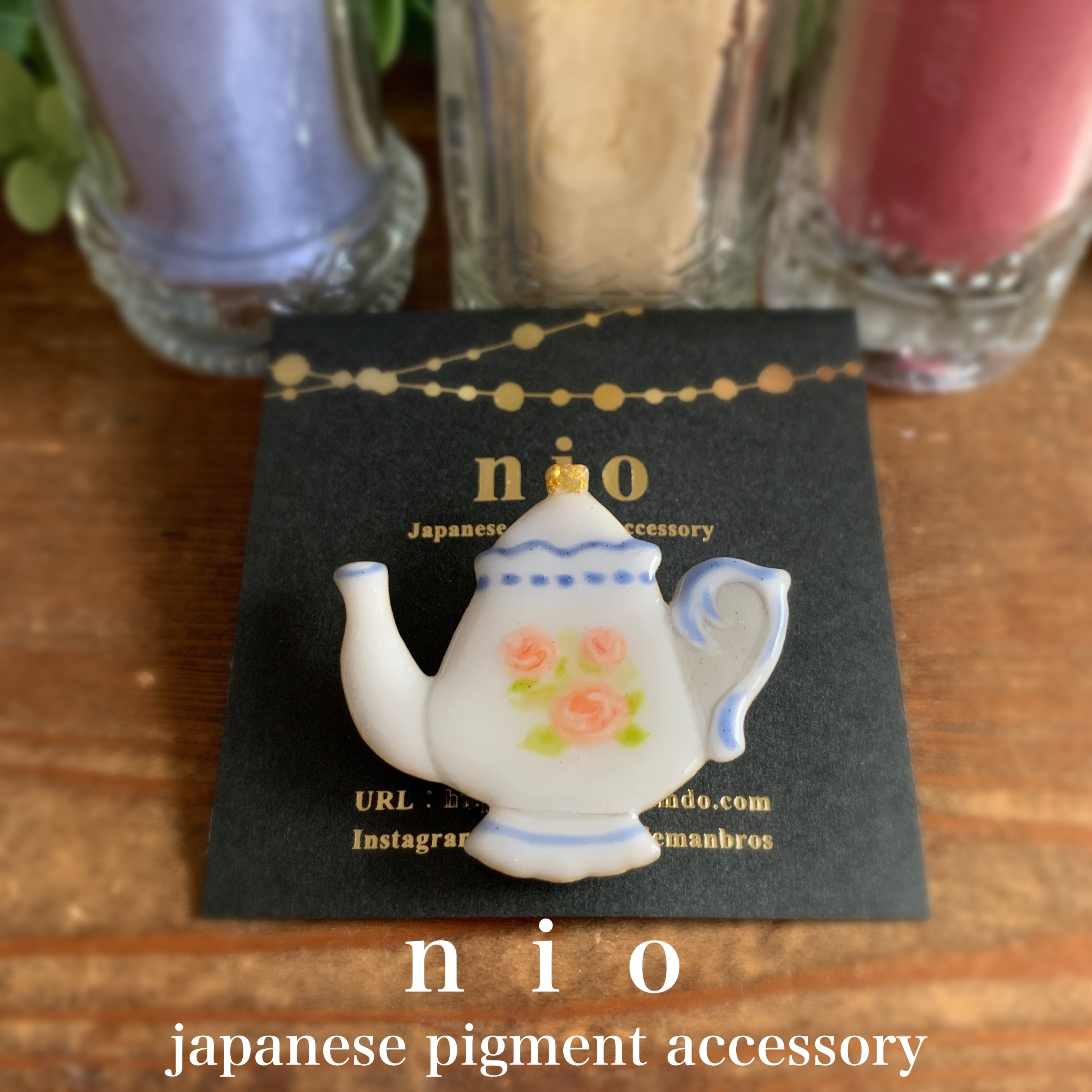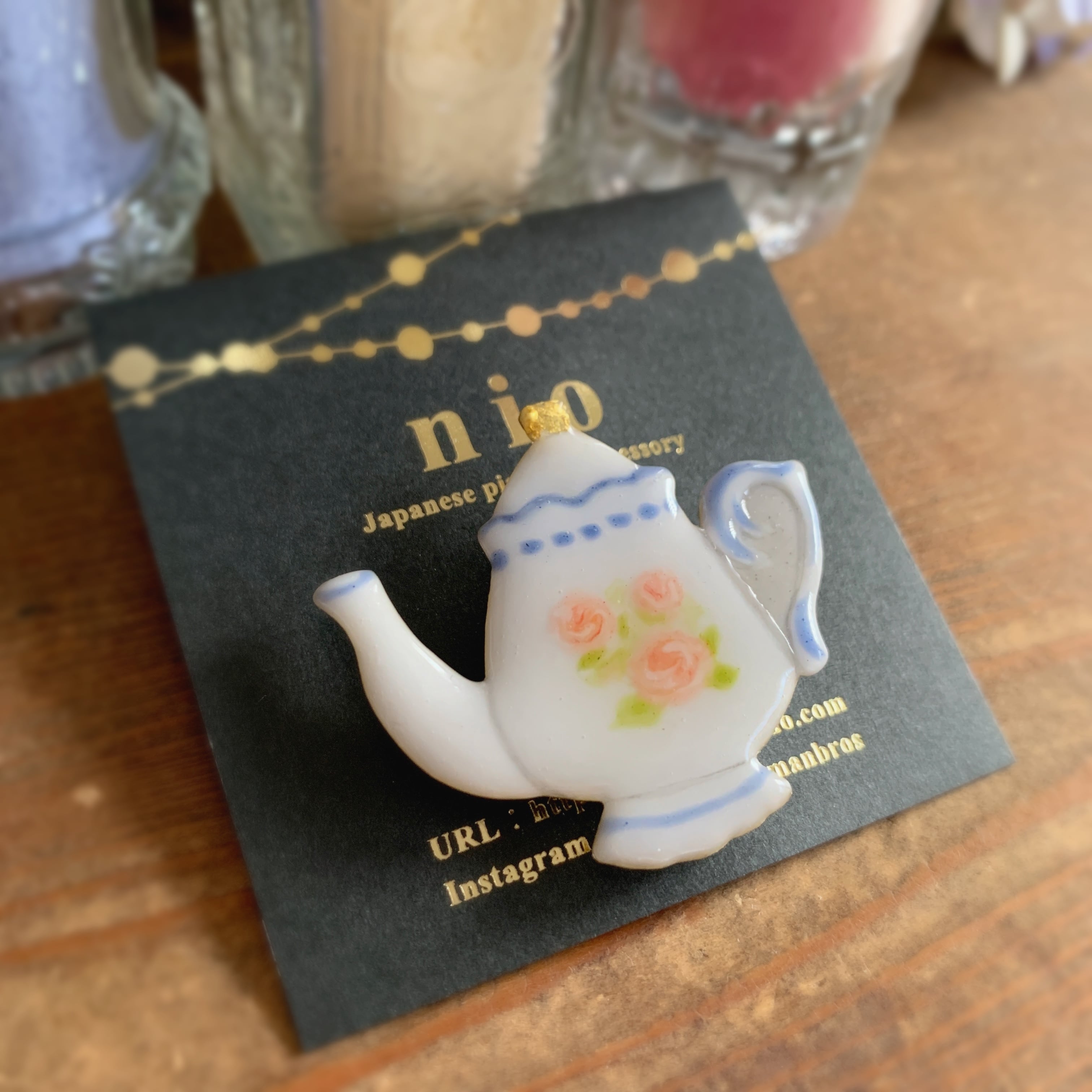優しい薔薇の絵を描いたティーポットのブローチ。